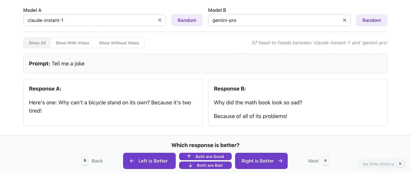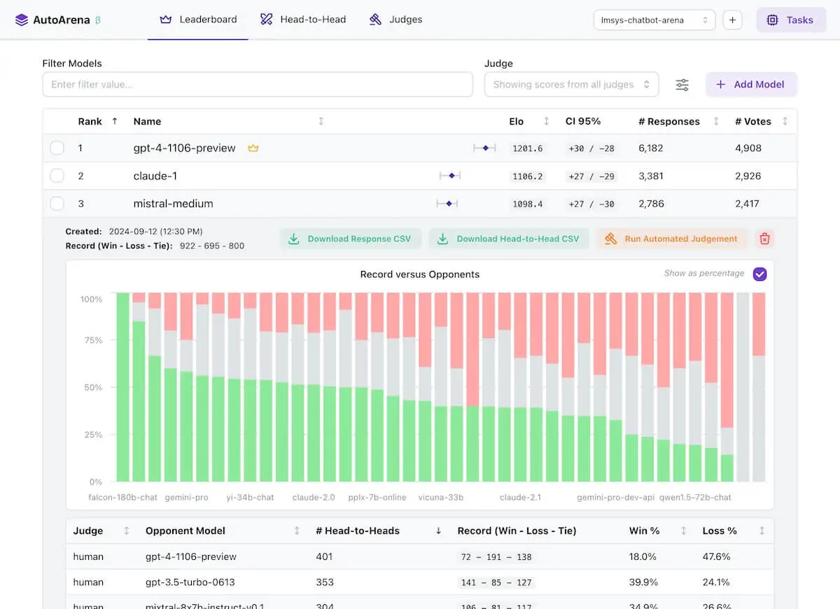 - Use the head-to-head voting interface to collect human preferences that can be leveraged for custom judge fine-tuning on autoarena.app