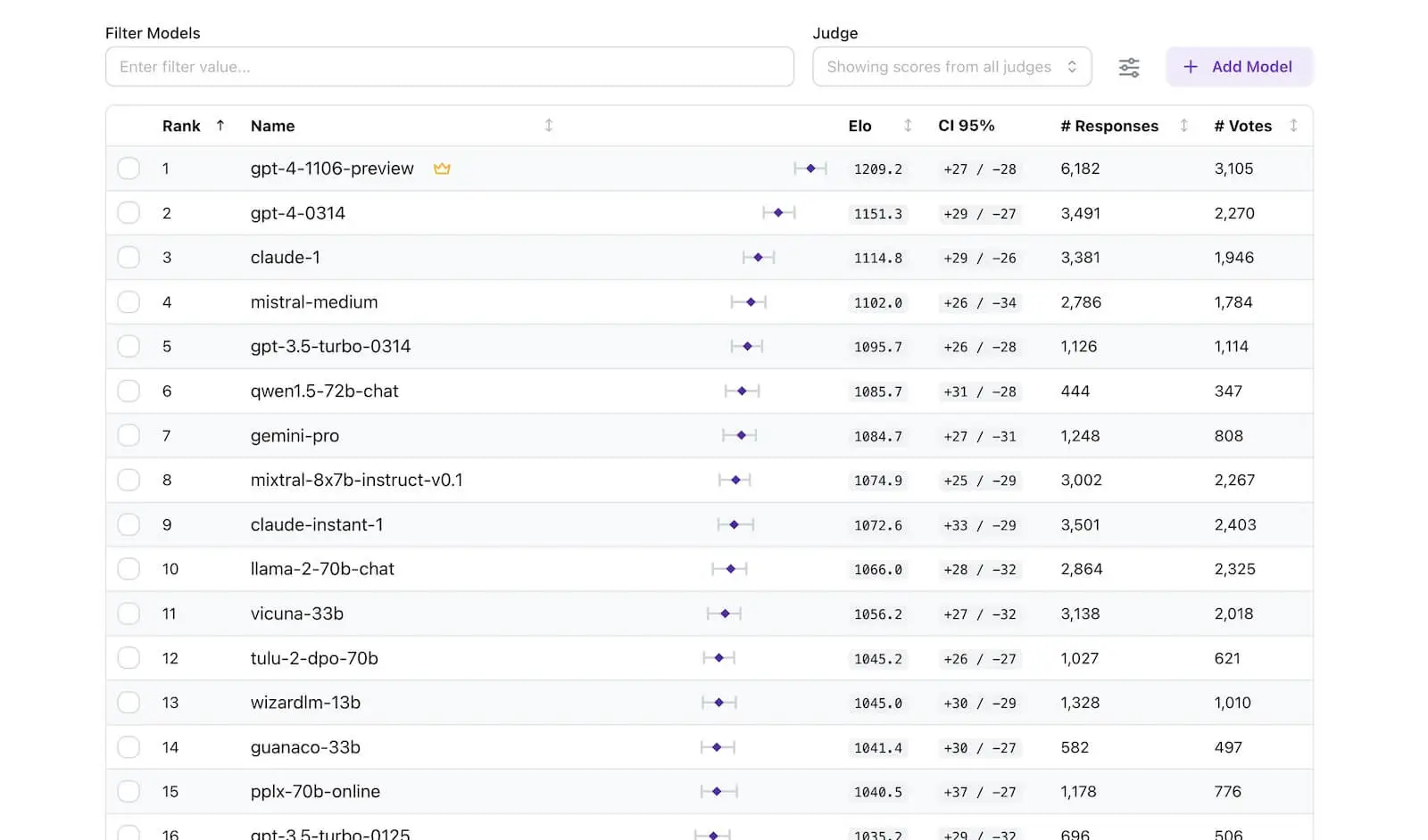 - Turn many head-to-head votes into leaderboard rankings by computing Elo scores and Confidence Intervals