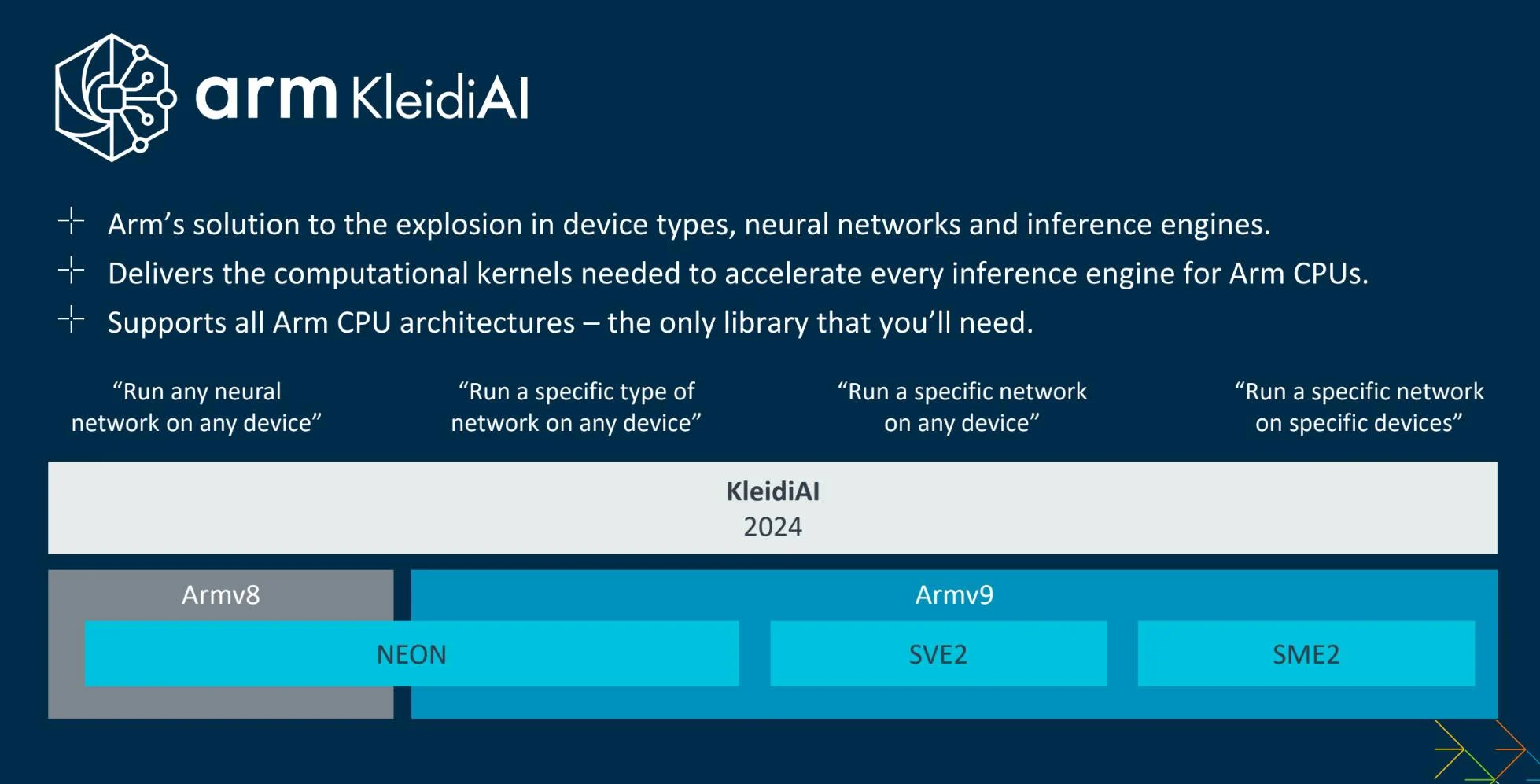 And so that brings us to KleidiAI (opens in a new tab), a handy open source library (opens in a new tab) Arm has made available, is still developing, and is said to be upstreaming to projects like the LLM inference driver Llama.cpp (opens in a new tab), that provides a standard interface to all of the potential CPU-level acceleration available on the modern Arm architecture. It's best illustrated with this briefing slide: