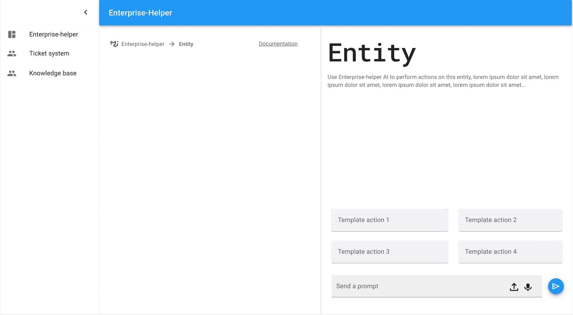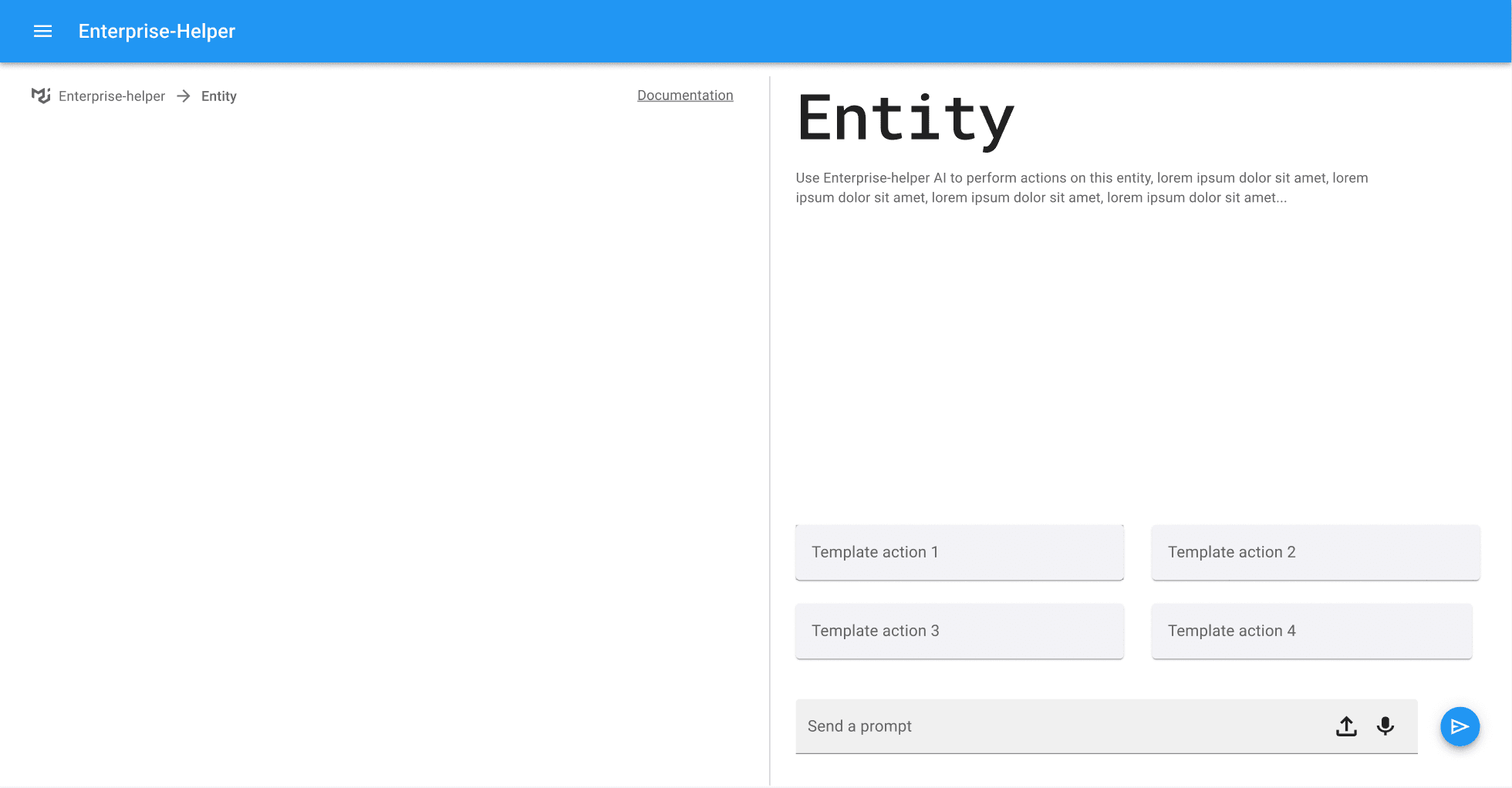 - In the chat area have buttons to perform actions on entities (generate an entity, suggest to add the generated entity into the actual list (main page area) of entities, apply button, cancel button)